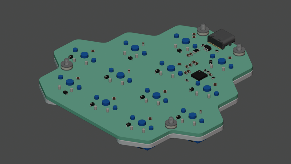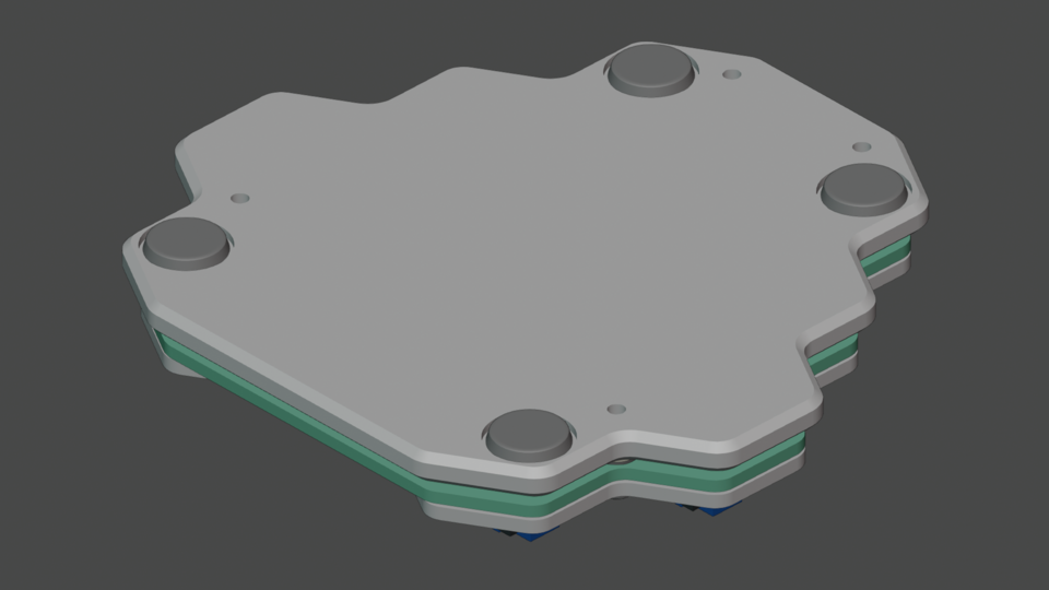 Now carefully place the PCB on top of the top plate, guiding the screws through the corresponding mounting holes. Make sure to align the board correctly, the USB port should be on the side facing you. Be careful when pushing the PCB down against the top plate and make sure that all switch pins end up in one of the solder pads. If you push down the PCB too quickly, you might bend misaligned switch pins.